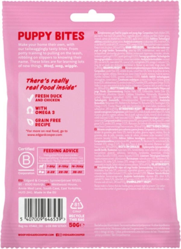 De Edgard & Cooper Puppy Bites Small zijn een verantwoorde en lekkere traktatie voor jouw puppy. Perfect om goed gedrag te belonen en samen te genieten van kleine geluksmomenten