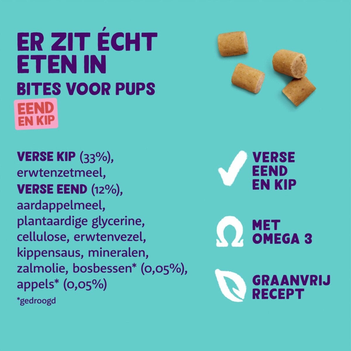 De snacks worden gemaakt met eend als hoofdingrediënt en bevatten zorgvuldig geselecteerde ingrediënten. De zachte structuur maakt ze makkelijk te kauwen en goed verteerbaar voor jonge honden. Daarnaast sluiten ze perfect aan bij een bewuste en liefdevolle verzorging van je puppy.