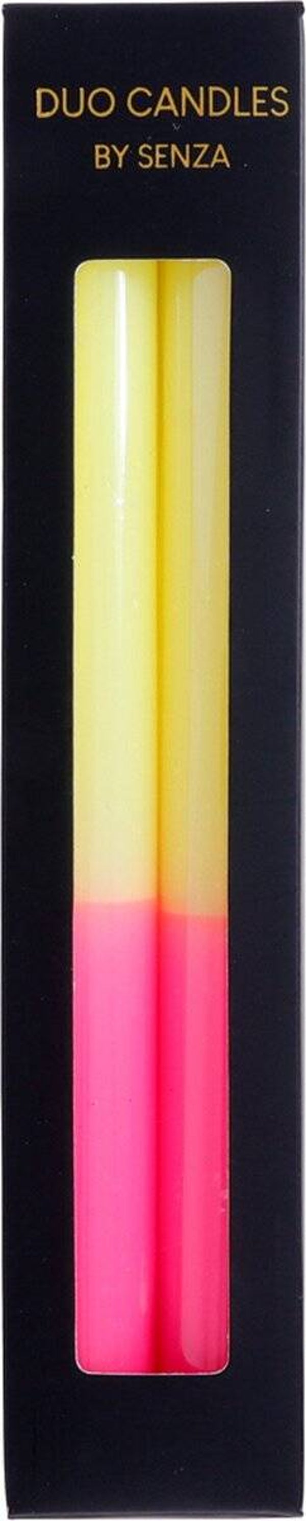 De Senza Duo Dinerkaarsen in geel met roze zijn de perfecte manier om sfeer en kleur toe te voegen aan je interieur of speciale gelegenheden. Dankzij het elegante, dubbele kaarsontwerp creëer je in een handomdraai een warme en uitnodigende ambiance.
